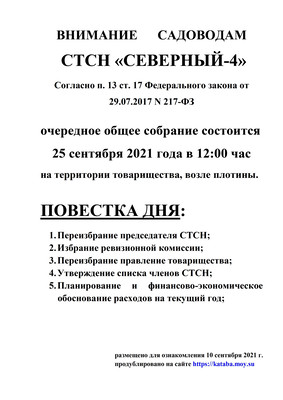 ВНИМАНИЕ САДОВОДАМ СТСН «СЕВЕРНЫЙ-4»