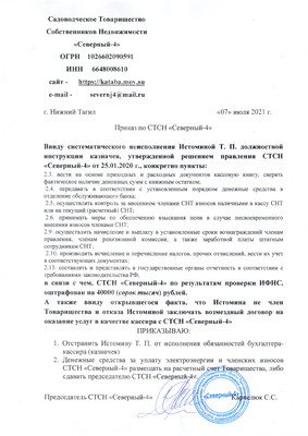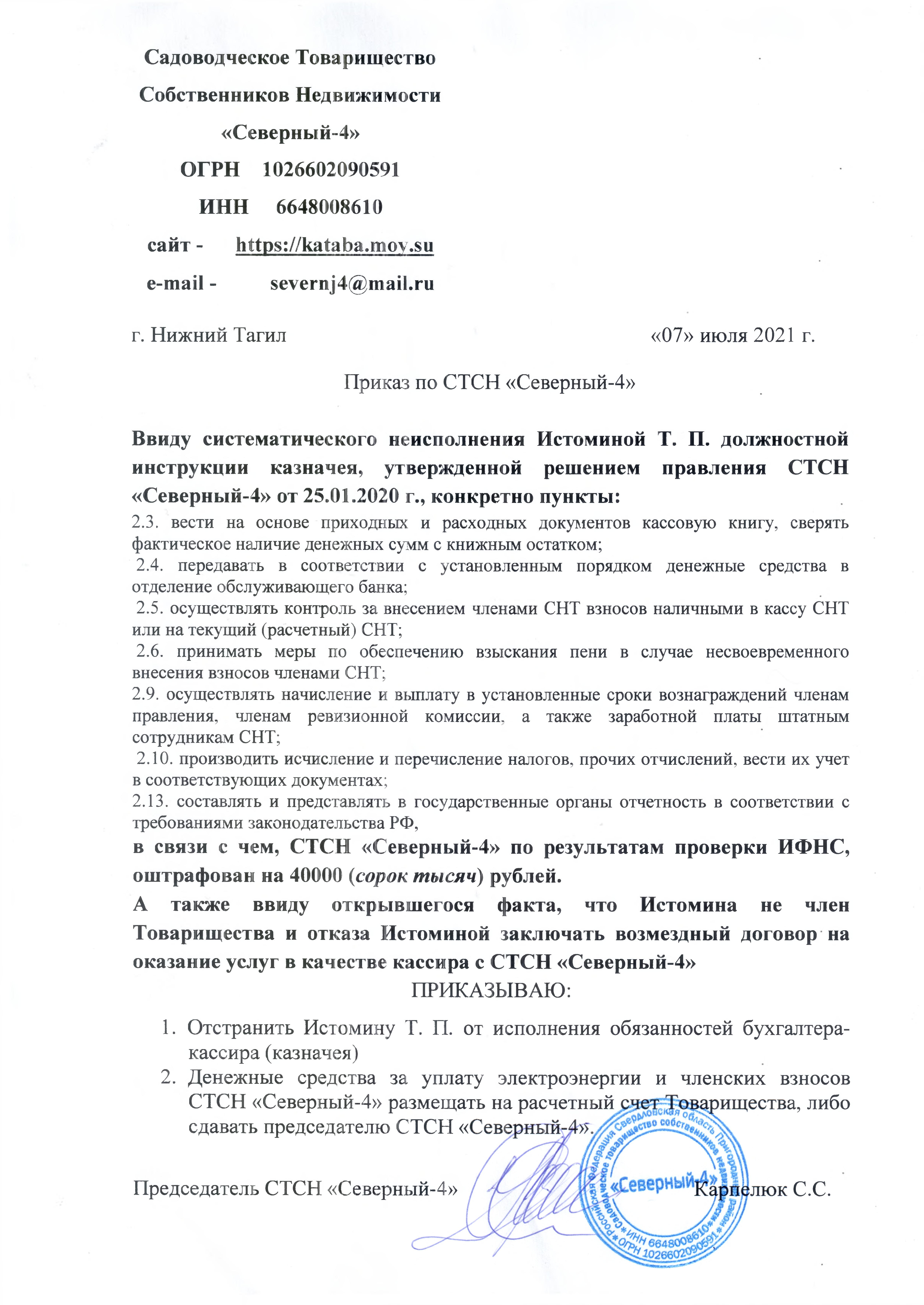Приказ по СТСН "Северный-4" от 07 июля 2021 года