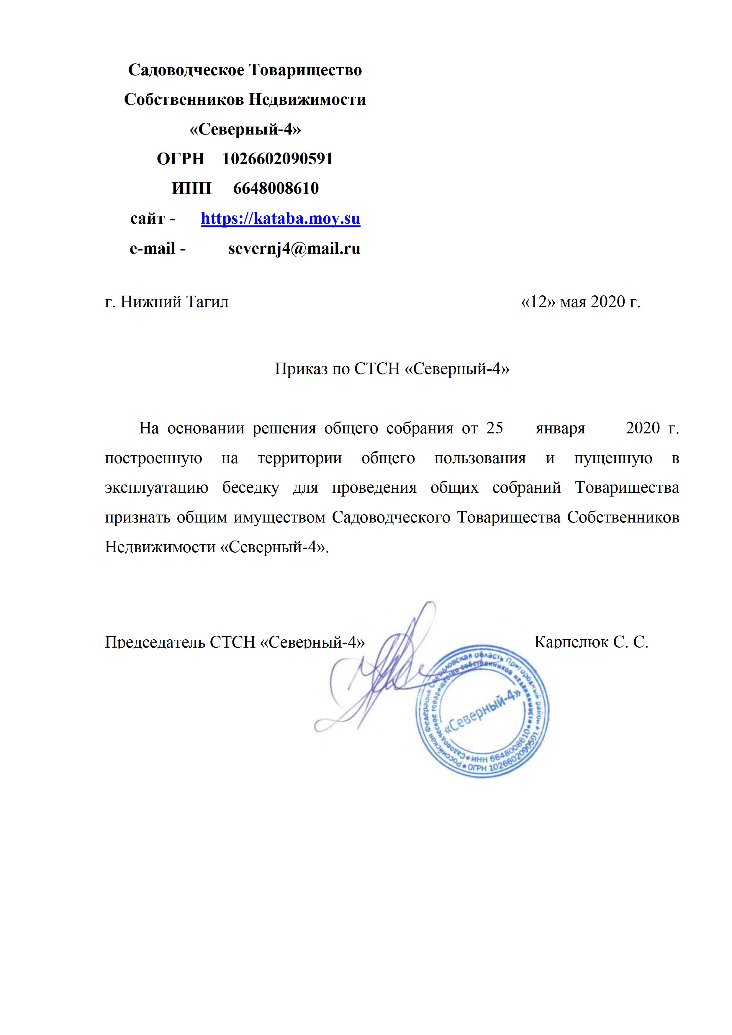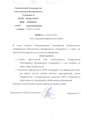 Приказ по СТСН "Северный-4" от 04 февраля 2020 года