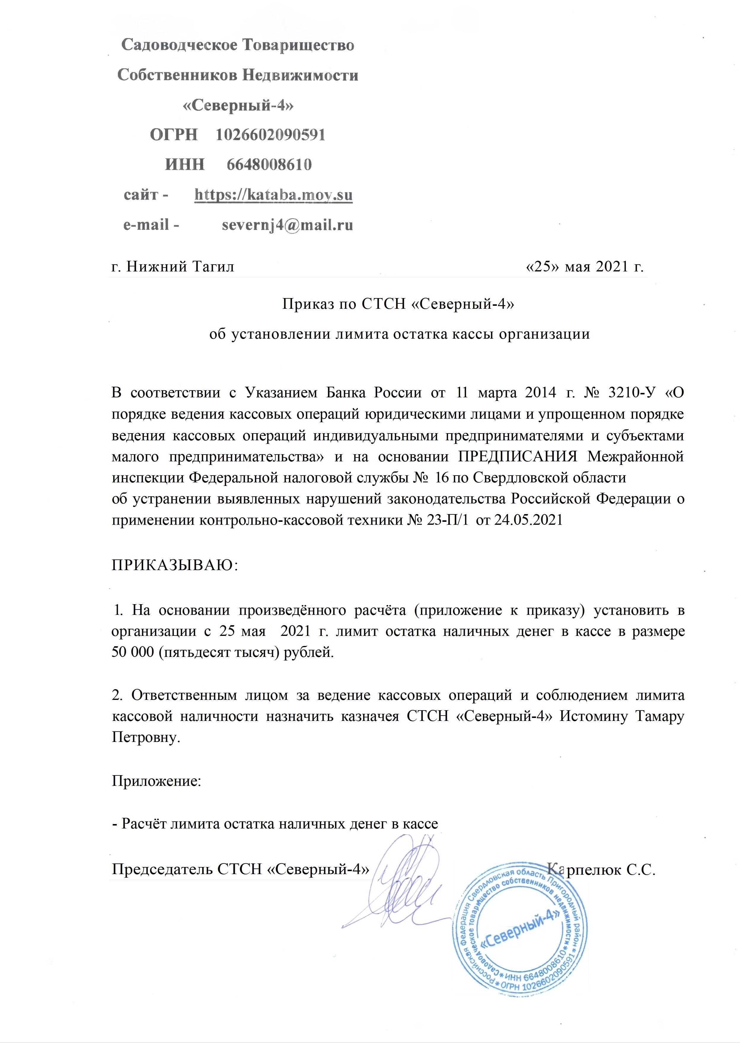 Приказ по СТСН "Северный-4" от 25 мая 2021 года