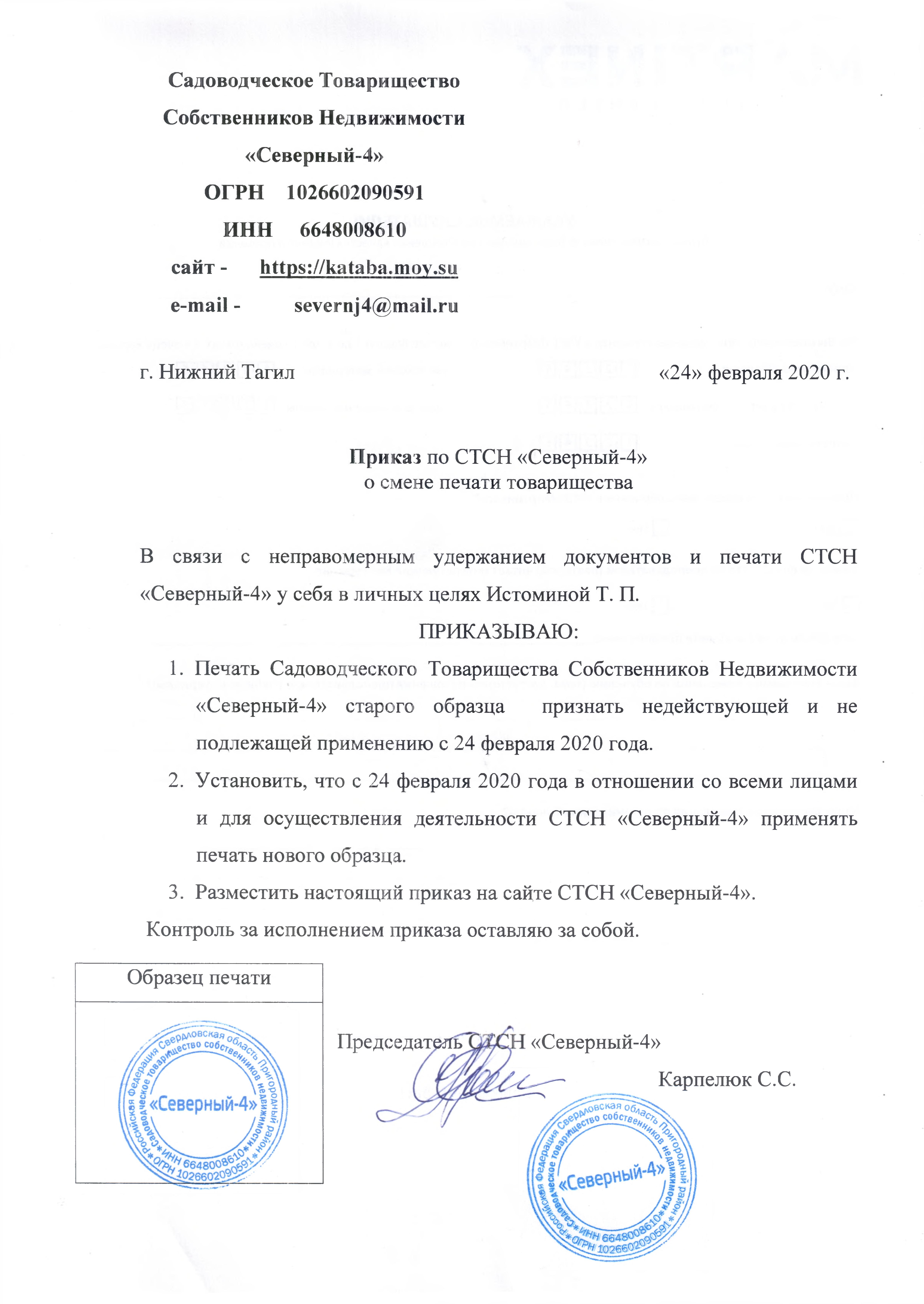 Приказ по СТСН "Северный-4" от 24 февраля 2020 года