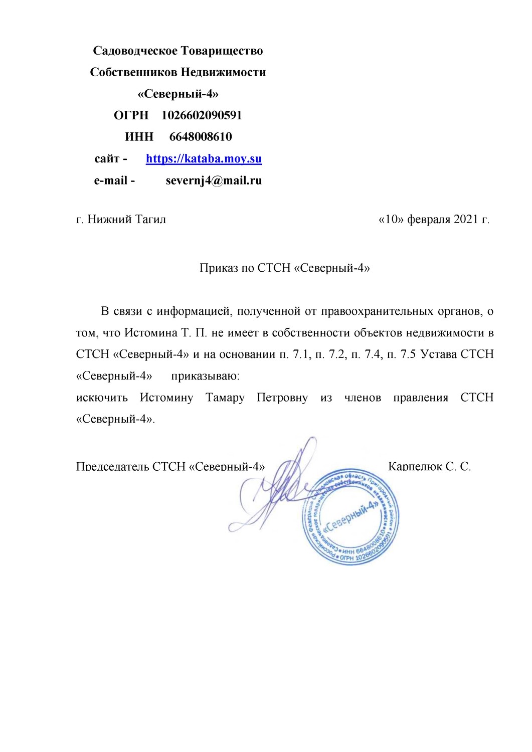 Приказ по СТСН "Северный-4" от 10 февраля 2021 года