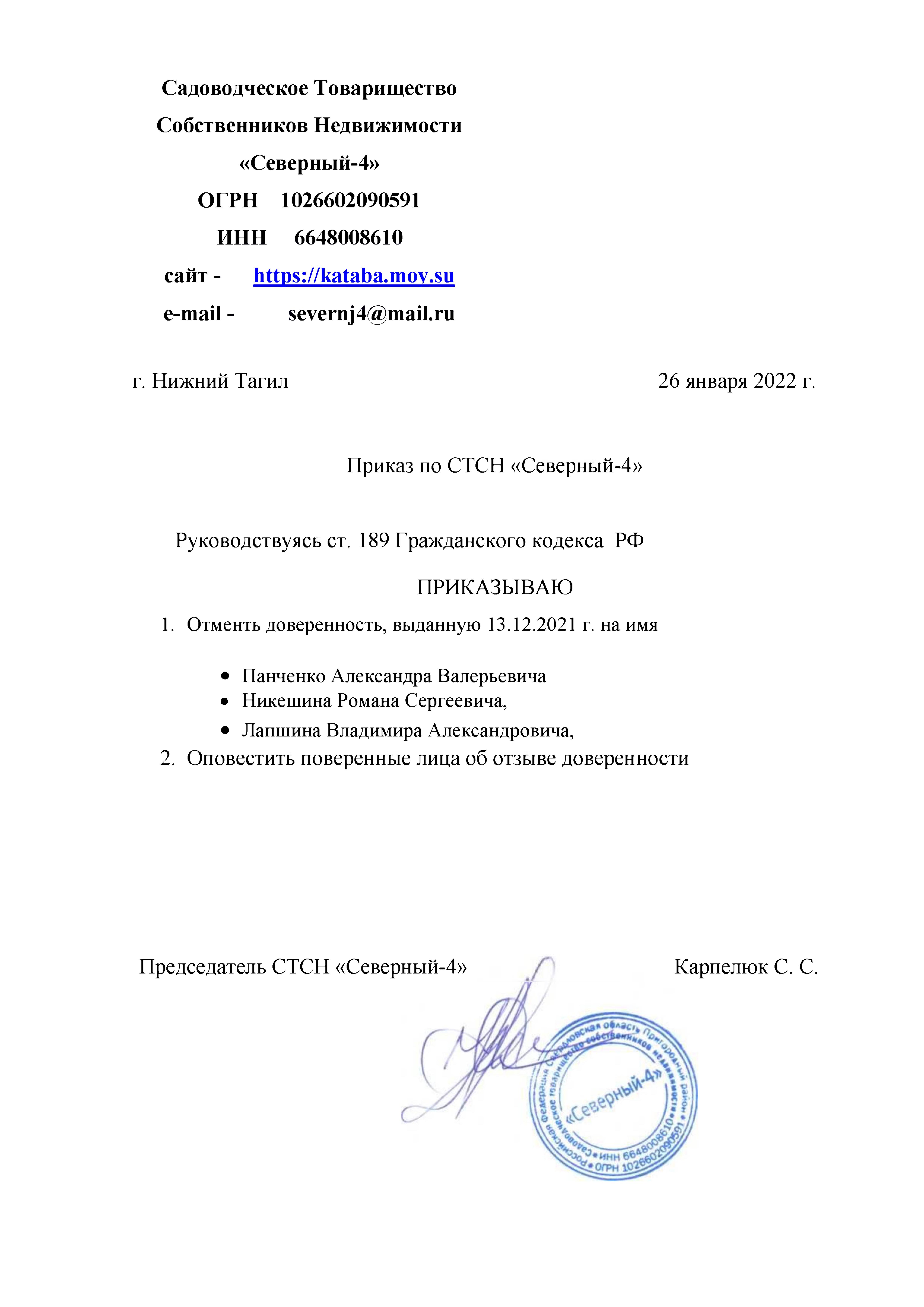 Приказ по СТСН "Северный-4" от 26 января 2022 года