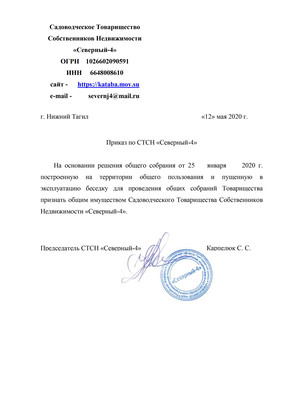 Приказ по СТСН "Северный-4" от 12 мая 2020 года
